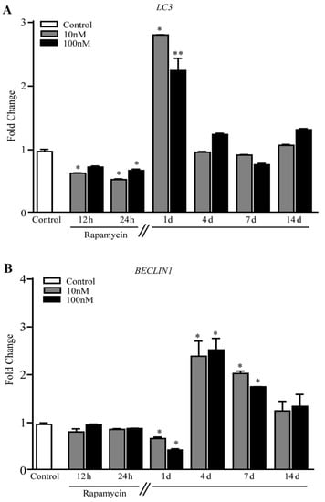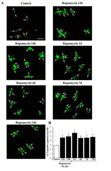 When rapamycin was administered for 24 h, the classic autophagy marker LC3 protein suddenly increased in line with its gene expression trend (representative pictures of Figure 14A). Such an increase persisted unmodified for 14 d without any noticeable decay, which surpasses the endurance of that described for the long-lasting increase in the gene expression levels (graph at Figure 14B).