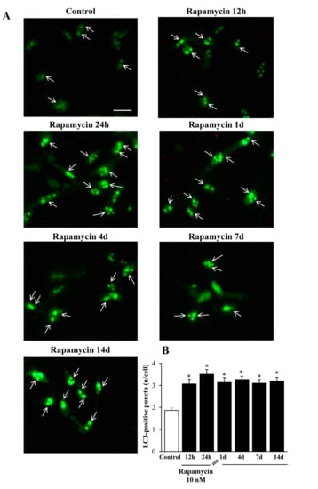 Rapamycin increases the immunofluorescence of LC3 within A172 cells. (A) Representative immunofluorescence from A172 cells. While arrows point to LC3 puncta (green). (B) Graph reports the number of LC3 puncta per cell. Values were obtained from 100 cells per group. * p ≤ 0.05 vs. Control. Scale bar: 25 μm.
