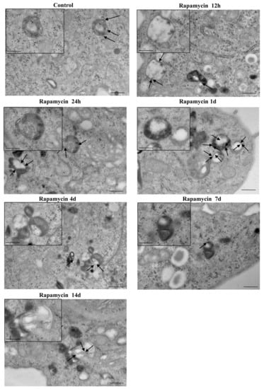 Representative pictures of rapamycin-induced LC3-stained and non-stained vacuoles within U87MG cells. The black box indicates high magnification inserts showing LC3-stained vacuoles. Black arrows point to LC3 immune-gold particles on vacuoles. Micrographs were obtained from 1 cell per group, for a total of 7 cells. Scale bar: 0.6 μm (low magnification); 0.20 μm (high magnification).