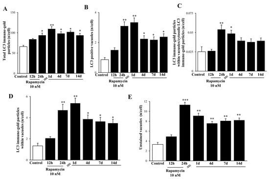 Rapamycin increases the amount of both LC3-stained and non-stained vacuoles within U87MG cells. LC3 immune-gold particles were increased by rapamycin within the cytosol (A) and vacuole compartments (B). The ratio of vacuolar/cytosolic LC3 was also increased by rapamycin (C), which also filled each LC3-positive vacuole with a higher stoichiometric density of LC3 proteins (D). Rapamycin increases the vacuolar compartment also considering those vacuoles which do not stain for LC3 (E). Values were obtained from 50 cells per group. * p ≤ 0.05 vs. Control; ** p ≤ 0.05 vs. Control and 12 h rapamycin; *** p ≤ 0.05 vs. all other groups.