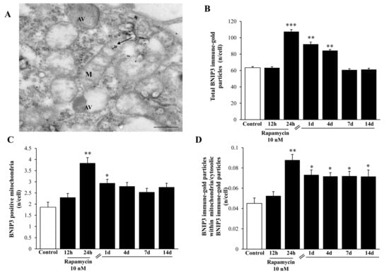 Rapamycin increases the mitophagy marker BNIP3 at short-time intervals within U87MG cells. (A) Representative BNIP3-stained mitochondrion (indicated by the black arrow) at 24 h during 10 nM rapamycin, continuous exposure. Graphs report: (B) the amount of total BNIP3 particles; (C) the number of BNIP3-positive mitochondria; (D) the ratio of mitochondrial/cytosolic BNIP3 particles at various time interval during (12–24 h) or following (from 1 d up to 14 d) rapamycin exposure. M = mitochondrion, AV = vacuoles. * p ≤ 0.05 vs. Control; ** p ≤ 0.05 vs. Control and 12 h; *** p ≤ 0 05 vs. other groups. Scale bar = 0.3 μm.