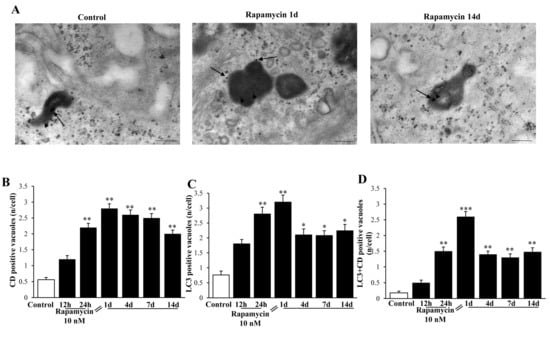 Rapamycin increases LC3+Cathepsin-D co-immune-stained vacuoles within U87MG cells. (A) Representative TEM micrographs show LC3+Cathepsin-D co-immune-stained vacuoles within Control cells and following 1 d and 14 d of rapamycin withdrawal. Arrowheads and black arrows point to LC3 (10 nm) and Cathepsin-D (20 nm) immune-gold particles, respectively. Graphs report the time-course of rapamycin-induced increase in (B) Cathepsin-D (CD) only immune-gold stained vacuoles; (C) LC3 only immune-gold stained vacuoles; (D) LC3 + Cathepsin-D immune-gold double-stained vacuoles. Rapamycin increases each vacuole immune-gold staining compared with Control. However, the effects produced on double-stained vacuoles exceeded at large what measured for single staining, which indicates a rapamycin-dependent autophagy progression toward lysosome. * p ≤ 0.05 vs. Control; ** p ≤ 0.05 vs. Control and 12 h. Scale bar: 0.2 μm.