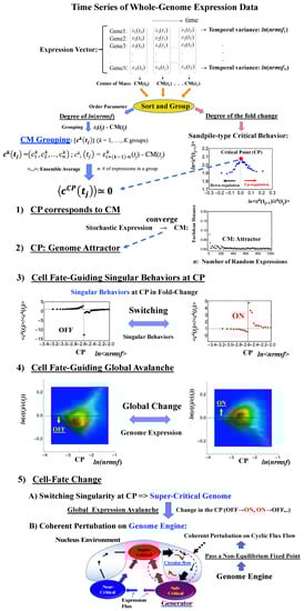 (1) The CP corresponds to the center of mass (CM(tj): the average value of whole-genome expression at t = tj) (Section 2.1). (2) The dynamics of the center of mass of any stochastic expression converge to that of whole-genome expression (i.e., CM(tj)). This shows that the CP is the genome attractor (Section 2.2). (3) The switching singular behaviors of the CP transform the genome into a super-critical state (i.e., super-critical genome). This in turn induces a “global expression avalanche”, which is revealed by (4) the probability density function (PDF) of whole-genome expression. (5) Lastly, a cell-fate change occurs after the genome becomes a “super-critical genome” (Section 2.3, Section 2.4, Section 2.5 and Section 2.6) and after the genome passes over a stable point (non-equilibrium fixed point) of the thermodynamically open system. This passing indicates symmetry-breaking which induces coherent perturbation of the genome engine (Section 3.1).
