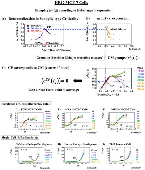 Fixed CP corresponding to the center of mass (CM) of genome expression: (A) Different numbers of groups (, k = 1,2,…,K: non-CM grouping; black: K = 20; blue: 30; red: 40 groups; groups contained 1113, 742, and 556 mRNA species, respectively) in HRG-stimulated MCF-7 cells followed the same sandpile-type critical behavior. This reveals the existence of scaling behavior (i.e., renormalization). (B) ln<nrmsf> value of the CP: logarithm plot of the average normalized root mean square fluctuation (nrmsf) value of a group, ln<nrmsf > vs. average expression value, shows that ln<nrmsf>CP~ −2.5 in sandpile-type criticality, where (10 min) represents the expression value of the kth group (ordered from high to low nrmsf values) at t = 10 min and <…> represents the ensemble average of group expression. Grouping for (A) and (B) is ordered according to the fold-change in expression at 0–10 min. (C) Grouping (CM grouping: Section 4.2.2) of whole-genome expression (baseline: CM()) according to nrmsf reveals that this can be considered a fixed point and corresponds to the CM of whole-genome expression. This is true for both the population (C–F) and single-cell levels (G–I). K represents the number of groups with n number of elements ((C), (D): n = 891 mRNAs; (E), (F): n = 505 mRNAs; (G): n = 685 RNAs; (H): n = 666 RNAs; (I): K = 25, n = 525 RNAs; coloring: Section 4.1).
