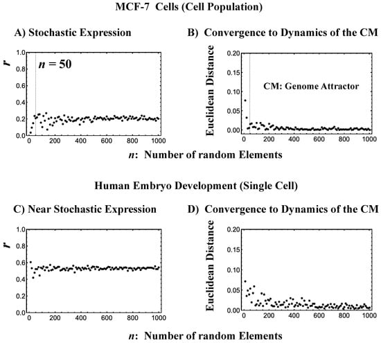 The center of mass (CM) acting as a genome attractor. MCF-7 cells (microarray data: (A) and (B)) and human embryo development (RNA-Seq data: (C) and (D)). The x-axis represents the number of randomly selected single-gene expression values in all four panels. Panels (A) and (C) illustrate that bootstrapping highlights a low pairwise Pearson correlation (y-axis) in randomly selected groups of expression (computed over experimental time points with 200 repetitions). This confirms the stochastic character of gene expression. Note: In (C), the removal of all genes with zero expression value at a specific cell state in RNA-Seq data does not change their correlation behavior (similar behavior is also observed in the mouse embryo case). Furthermore, the higher correlation in the embryo case makes the convergence to the CM, shown in (D), slower than in the cancer case (B). Panels (B) and (D) illustrate, in terms of Euclidean distance (y-axis; refer to the convergency of critical-state attractors: Section 2.6), the convergence of the dynamics of the CM of a randomly selected group of gene expression to that of the CM of whole-genome expression as the number of selected genes increases (average of 200 repetitions). The CP, the CM of whole-genome expression according to nrmsf, acts as the genome attractor (see Section 2.6 for heteroclinic attractors). Note: For the rest of the biological regulations throughout this report, similar behaviors are observed. The dashed lines in (A) and (B) indicate that coherent behaviors emerge at n = 50 single-gene expression values. Refer to experimental time points in Section 4.1.