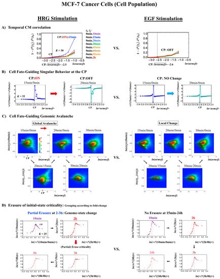 HRG- (left) and EGF-stimulated (right) MCF-7 cell-population responses. The CM correlation analyses reported in this figure are relative to gene groups ordered along their relative nrmsf: in (A), temporal CM correlation (x-axis; see Section 4.2.2): (y-axis) is evaluated. At 15 min, the correlation response for HRG stimulation diverges from other responses, indicating that the CP is activated between 10 and 15 min for HRG, whereas for EGF stimulation, such a distinctly diverging correlation response does not occur (i.e., the CP is inactivated). Activation or inactivation of the CP marks the occurrence of cell differentiation for HRG and only proliferation (no differentiation) for EGF. Panels (B) and (C) provide direct evidence of the ON/OFF state of the CP. (B) The transition of the higher-order structure of the CP occurs for 15–20 min as shown in the fold-change from the initial time point. The swolled coil state (dominant positive fold-change: y-axis) at 15 min and compact globule (dominant negative fold-change) state at 20 min respectively correspond to the ON and OFF states of the CP (K = 35 groups, with each group containing n = 636 mRNAs). The sensitivity in singular behaviors at the CP is observed according to the number of groups. Throughout this report, to double the number of groupings, a new group is added to the plot, where the group is created by combining two halves from the nearest neighbors of the CM groups, and its average expression is evaluated. (C) The probability density function (PDF; see Section 4.2.3) of whole-genome expression (z-axis) shows that a global expression avalanche occurs at 15–20 min (coinciding with the change in the CP), where the maximum probability density occurs around the CP with a positive value of the natural log of fold-change (i.e., the CP is ON) at 15 min, whereas it becomes negative (OFF) at 15–20 min. (D) The (partial) erasure of initial-state criticality (grouping according to the fold-change in non-reference expression,: K = 25: n = 891 mRNAs) occurs at 2–3 h for HRG (indication of genome-state change) and no erasure for EGF.