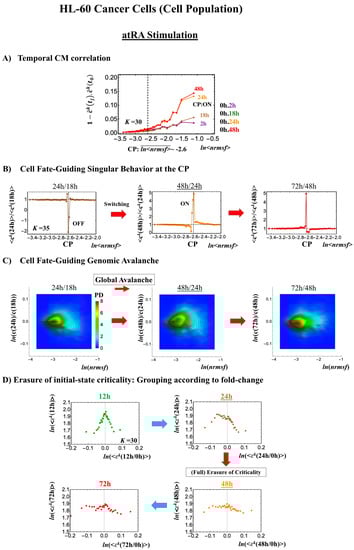 Figure 5. atRA-stimulated HL-60 cell population. (A) The divergent behavior of the temporal CM correlation with the initial whole-genome expression (t = 0) occurs at 24 h (K = 30: n = 420 mRNAs). This divergent response occurs for the ON state at 24 h indicated by (B) and (C). (B) Transition of the higher-order structure at the CP (K = 35: n = 360 mRNAs) is suggested to occur at 24–48 h, when initial-state criticality is erased (D). The switching of singular behaviors at the CP occurs with bimodal behaviors of the fold-change around the CP. The dominant negative fold-change indicates that the OFF state (compact globule DNA) occurs at 18–24 h, while the dominant positive fold change (swollen coil DNA) occurs at 24–48 h. (C) The temporal change in the PDF shows that a global avalanche occurs from 18–24 h (PDF: contracted) to 24–48 h (swollen) to 48–74 h (contracted), which supports the switching behaviors of the CP (B). (D) The full erasure of initial-state criticality occurs at 24–48 h, which indicates a cell-fate change. Underlined numbers represent the timing of the cell-fate change. - (2)