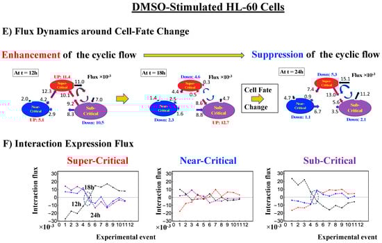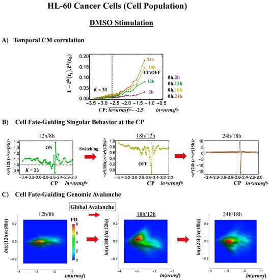Figure 6. DMSO-stimulated HL-60 cell population. (A) The divergent behavior of the temporal CM correlation with the initial whole-genome expression (t = 0) occurs at 18 h (K = 30: n = 420 mRNAs). This positive divergent response occurs for the OFF state at 18 h indicated by (B) and (C) (refer to the cosine function, even-function around zero of two expression vectors; see Section 4.2.2). (B) Transition of the higher-order structure at the CP (K = 35: n = 360 mRNAs) from a swollen coil (ON) to a compact globule state (OFF) to a neutral state (neither ON or OFF; see (C)) at 18–24 h is suggested to occur at 12–18 h and 18–24 h for DMSO stimulation, when the initial-state criticality is erased (D). The sensitivity in singular behaviors at the CP is observed according to the number of groups. (C) The temporal change in the PDF shows that the probability density around the CP (ln<nrmsf> ~ −2.5) changes from positive to negative to zero, supporting the results of (A) and (B). This shows that a global avalanche occurs at 12–18 h and 18–24 h. (D) Full erasure happens at 8–12 h and 18–24 h for DMSO. The erasure of initial-state criticality occurs at 12–18 h, and thereafter, recovery of the initial-state criticality at 18 h indicates the existence of two SOC landscapes at 8–12 h and 12–18 h, respectively.