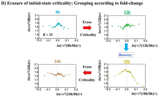 As for the DMSO response, it is interesting to observe a multi-step process of erasure of initial-state sandpile criticality (Figure 6D): erasure at 8–12 h; recovery of criticality at 12–18 h; and then erasure again at 18–24 h. Multiple erasures suggest that the cell-population response passes over two SOC landscapes [] at 8–12 h and 18–24 h.
