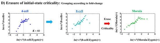 - This is confirmed by a temporal change in the PDF (Figure 8C): during cell development from the middle 2-cell to 4-cell states through the late 2-cell state (2-cell L), the whole density profile reflects along the axis of zero-fold change. This clearly manifests as the ON state of the CP at the middle 2-cell – late 2-cell state, and as the OFF state at the late 2-cell – 8-cell state. There are also three distinct scaling behaviors, as in human embryo development. Notably, during the middle 2-cell to 4-cell state through the late 2-cell state, whole-genome expression shifts from up- to downregulation, i.e., marking the occurrence of a global avalanche, and furthermore, there is a reflection of the scaling behavior in the local sub-critical state (ln(nrmsf) < −11) along the zero-fold change axis (y = 0). This reflection illustrates that a coherent switching of folding and unfolding chromatin dynamics occurs, which supports the important role in the local sub-critical state in early embryo development [].