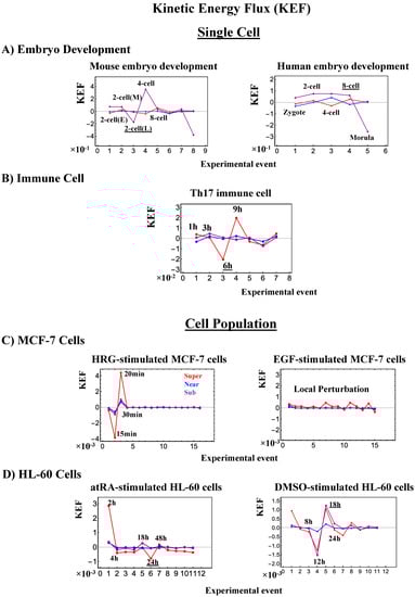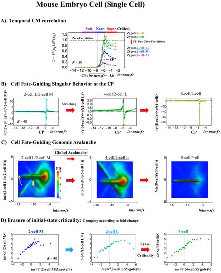 Embryo development starts from a single cell (zygote) and thus corresponds to a completely different situation than in the cases discussed above, where the data refer to averages over millions of cells in a plate (i.e., cell-population level). The CP acts as a genome attractor at the single-cell level and in cell populations (Figure 3). In temporal CM correlation, the CP is a point with no differential (Figure 7A, Figure 8A and Figure 9A), while it appears as a divergent point in cell populations. This feature reveals distinct response domains (critical states) in single-cell genome expression.