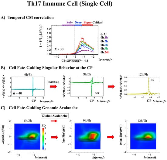 Differentiation of Th17 immune cells from Th0 cells (single-cell). (A) The CP features are the same as in the embryo cases; the only difference is that the CP never passes the zero-temporal correlation (K = 30, n = 437 RNAs). (B) The switching singular transition (K = 40: n = 328) at the CP (genome attractor) occurs from 3 to 9 h through 6 h, which induces (C) a large-scale (but not whole-genome as in the embryo cases) expression avalanche: swelling of the density profile from 3–6 h, and then contraction at 9–12 h. The timing of the cell-fate change (differentiation of Th17 cells from Th0) after 6 h is demonstrated by (D) erasure of the initial-state (t = 0) criticality. This timing is further supported by the same timing as in the switch from suppression to enhancement of the genome engine (see Section 3.1). The sensitivity of singular transition at the CP is observed according to the number of groups.