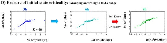- The switching singular transition at the CP (genome attractor) occurs sequentially from 3 h to 12 h (Figure 9B). This manifests as the OFF state of the CP at 6–9 h and as the ON state at 9–12 h. Figure 9C illustrates that the change in expression for switching is still on a large scale, which is confirmed by the temporal change in the PDF of whole-genome expression. However, there is no distinct scaling behavior as in embryo development.