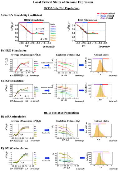 Figure 10. Systemic determination of local critical states for a cell population (microarray data). (A) In MCF-7 breast cancer cells, Sarle’s bimodality coefficient (b >5/9: onset of bimodal profile) shows that around the CP, a unimodal-to-bimodal transition (from high to low nrmsf) occurs for the group expression profile (K = 30: n = 742 mRNAs), which reveals three distinct profiles (red: super-; blue: near-; purple: sub-critical state) in whole-genome expression (left: HRG stimulation; right: EGF stimulation). To confirm these distinct behaviors (see panels (B) and (C)), which are based on the temporal response of the CM group (first column; refer to Figure 2), we examined the Euclidean distance (second column) between two ensemble averages, < and , (k = 1, 2,…,K = 25) from higher nrmsf, and confirmed three distinct behaviors with a boundary indicated by dashed vertical lines. Similarly, for HL-60 human leukemia cells, the corresponding results are shown for (D) atRA stimulation and (E) DMSO stimulation. In the third column (B–E), the corresponding region of critical states is shown in a histogram of gene expression according to ln(nrmsf). Note: The CP lies at the boundary between near- and sub-critical states, different from the case with a single cell (Figure 7, Figure 8 and Figure 9).