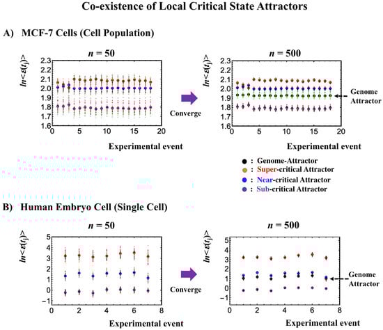 Local critical state attractors. Panels (A) for MCF-7 cells and (B) for human embryo cells illustrate that bootstrapping highlights that the convergence of the center of mass (CM) of randomly selected expression, n = 50 and n = 500 expressions, selected from a critical state converges to the CM of the critical state. For each random sampling, 40 repetitions were computed over experimental time points as depicted by each of the small circles. Large colored circles represent the CM of critical states (red: super-critical; blue: near-critical; purple: sub-critical state; see the number of expressions in local critical states in Table 1 and Table 2). The x-axis and y-axis correspond to experimental time points (Section 4.1) and the natural logarithm of the average of group expression, respectively. These confirm the existence of local critical states, and furthermore, their CM corresponds to local attractors (also confirmed in other biological regulations). Note: A mixture of critical states does not converge to the CM (see Figure 3 in []), showing that the genome attractor develops to form a heteroclinic critical-state attractor system.