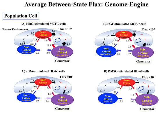where state with X, and M is the number of internal interactions (M = 2), i.e., for a given critical state, there are two internal interactions with other critical states. Equation (5) tells us that the sign of the difference between the net self-flux and the overall contribution from internal critical states, reveals incoming flux (positive) from the environment to a critical state or outgoing flux (negative) from a critical state to the environment. When the difference in all critical states is zero, the genome system itself lies in a stable point (non-equilibrium fixed point) of a thermodynamically open system (no average flux flow from the environment). Average between-state flux (Figure 12) represents a stable manifold of the thermodynamically open system.