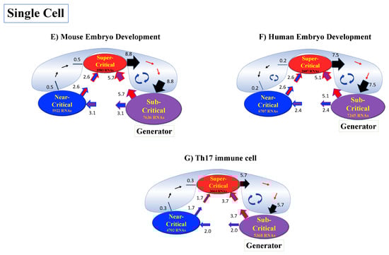 Genome engine mechanism revealed through average between-state expression flux. Cell population: (A) HRG-stimulated and (B) EGF-stimulated MCF-7 cancer cells; (C) atRA-stimulated and (D) DMSO-stimulated HL-60 cancer cells. Single-cell: (E) mouse and (F) human embryo development; (G) Th17 immune cell development. Figures show a common genome engine mechanism: sub-super cyclic flux forms a dominant flux flow to establish the genome engine mechanism. The sub-critical state acting as a “large piston” for short moves (low-variance expression) and the super-critical state acting as a “small piston” for large moves (high-variance expression) with an “ignition switch” (a critical point: the genome attractor) are connected through a dominant cyclic state flux as a “camshaft”, resulting in the anti-phase dynamics of two pistons (see the next Figure). Numerical values represent average between-state expression flux, whereas in the cell population, the values are based on a 10−1 scale.