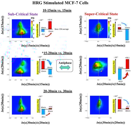 Dynamics of coherent behaviors around a phase transition in HRG-stimulated MCF-7 cells. The PDF (Section 4.2.3) reveals that the dynamics of coherent behaviors emerge in the stochastic gene expression in local critical states (sub-critical: left panel and super-critical states: right). This describes the anti-phase dynamics between the critical states and how sub-critical and super-critical attractors (Figure 11) dynamically self-organize stochastic gene expression as coherent oscillatory dynamics (see details in [,]). The vertical (x-axis) coherent oscillatory (up- and down-) regulations are explained by positive (obtaining flux) and negative (sending flux to other states) expression flux dynamics of critical states based on the genome engine (refer to Section 3.1). The biggest change in expression flux occurs between 15–20 min, which coincides with the timing of a global avalanche (Figure 4). The x- and y-axes represent the natural log of the fold-change and whole-genome expression vectors from the CM of critical states (Section 4.2.3), where whole-genome expression is ordered by the degree of nrmsf (see Figure 1).