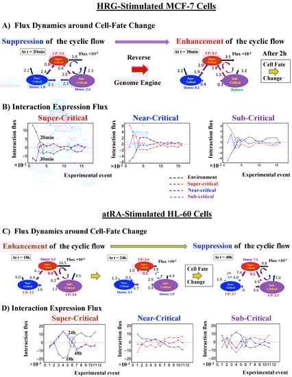 Thus, dynamic expression flux analysis (Section 4.2.4) for the CM of critical states can be applied to reveal the genome engine mechanism for describing how autonomous SOC control of genome expression arises. Figure 12 shows that the sub-critical state acts as an internal source of expression flux and the super-critical state acts as a sink. The cyclic flux forms a dominant flux flow that generates a strong coupling between the super- and sub-critical states accompanied by their anti-phase expression dynamics (Figure 13). This results in a change in oscillatory feedback to sustain autonomous SOC control of overall gene expression. The average between-state flux (Figure 12) represents a stable manifold for the thermodynamically open system. Formation of the dominant cyclic flux provides a genome engine metaphor for SOC control mechanisms pointing to a universal mechanism in the gene-expression regulation of mammalian cells for both the population and single-cell levels. As demonstrated in Section 3.1, global perturbation stems from the change in CP, which either enhances or suppresses the genome engine, and thus transforms the cell-fate change.
