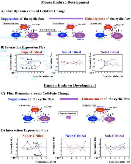 Therefore, with the results regarding temporal CM correlation, we conclude that a major the cell-fate change (embryonic reprogramming) occurs after the 8-cell state. This coincides with the timing of inverse coherent perturbation of the genome engine (cyclic flux flow), where the genome system passes over the non-equilibrium fixed point after the 8-cell state (the onset of symmetry-breaking occurs; see Section 3.1).
