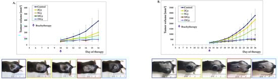 Inhibition of B16-F10 tumor growth in response to brachytherapy. Mice with well-developed tumors ((A): 60–70 mm3; n = 5; (B) 180–200 mm3; n = 5) were treated with different doses (2–15Gy) of brachytherapy. Brachytherapy in a single dose of 2Gy slightly inhibits the growth of B16-F10 tumors compared to the control group. A single dose of 5Gy reduced tumors growth compared to the 2Gy and untreated groups of mice. The most effective tumor growth inhibition was observed in the group of mice that received a brachytherapy in a single dose of 10Gy or 15Gy. * p < 0.003 compared to compared to 2Gy and control groups, the ANOVA followed by the Tukey’s post hoc test. Photographs were taken on the 16th (A) and 28th (B) days of therapy. (C) Individual tumor follow-up.