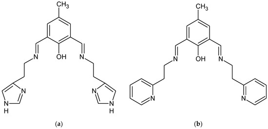 To the 2-hydroxy-5-methyl-1,3-benzenedicarboxaldehyde (0.2396 g; 1.46 mmol) in warm ethanol histamine dihydrochloride (0.5374 g; 2.92 mmol) in sodium hydroxide solution (0.1200 g in 10 mL water) was added. The reaction mixture was refluxed for 4 h and the solvent was removed on a rotary evaporator. The product was dried under air, received orange oil (m = 0.3902 g, 1.11 mmol Yield 96%). C19H22N6O (calc./found%): C 65.12/65.41, N 23.97/24.11, H 6.32/6.29.
