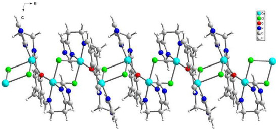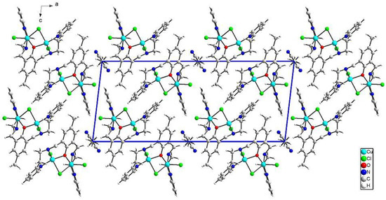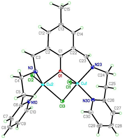 Dinuclear copper complexes are also models of active copper containing enzymes, e.g., hemocyanin or cytochrome c [9,10], and they are meaningful as precursors in the chemistry of supramolecular and discrete molecular high-nuclearity Cu(II) complexes [11,12,13,14]. The variety of organic ligands is essential in coordination chemistry as they influence the magnetic, spectroscopic properties, and geometry of complexes [12,13,14,15,16,17,18,19,20,21,22,23,24,25]. Different species were used as bridging ligands in copper complexes, i.e., cyanate, thiocyanate [4,23], phenoxo [24], chloride [11]. The studies of a series of phenoxo- and hydroxo-bridged dicopper(II) complexes obtained from bis(2-methylpyridyl)aminomethyl as complexing arms with different substituting groups, e.g., CH3 or OCH3, demonstrated that a slight modification of the ligand topology may significantly affect the spectroscopic and redox properties of the complexes and may lead to developing of transient, mixed-valent Cu(II)-Cu(III) complexes [12].