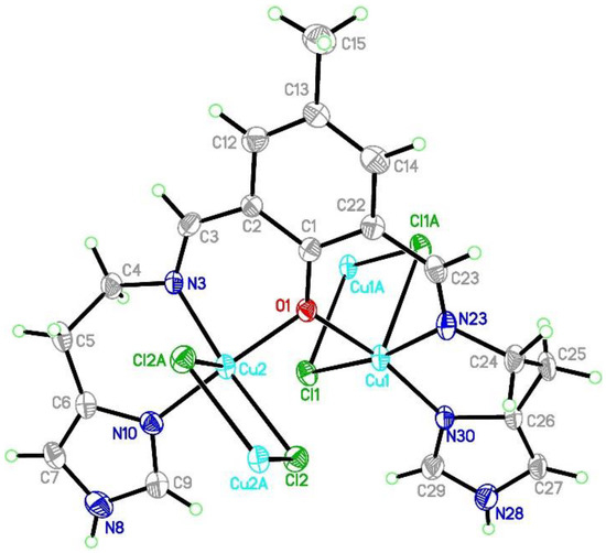 The ligands derived from 2-hydroxy-5-methylisophthaldehyde were applied in the bi- and multinuclear copper(II) compounds synthesis [25,26,27]. It has been proved that this aldehyde plays an important role in the coordination chemistry because it functions as building blocks for binucleating macrocyclic and non-macrocyclic ligands. Chloro-bridged binuclear copper(II) complexes exhibit diverse structural properties and are applicable in molecular magnetism [27,28]. As a consequence, for these chloro-bridged complexes, several magnetic interaction pathways exist and both ferro- and antiferro-magnetism are possible depending on the nature of a coordinated ligand and distortions of the metal center geometry. Therefore, each type of a structural dimer has to be studied separately in order to draw magneto-structural correlations and determine the extent of this correlation.