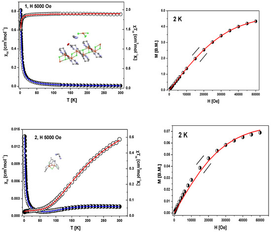 The molar magnetic susceptibility for 1 and 2 complexes has been converted to the χMT product (or effective magnetic moment) whose temperature dependence is displayed in Figure 6, left panels. The field dependence of the magnetization per formula unit M1 = Mmol/NAµB at the constant temperature is shown in Figure 6, right panels.