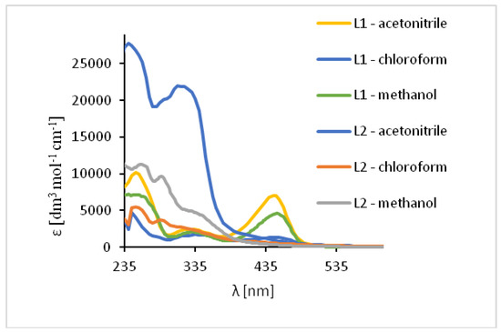 Solution absorption spectra of ligands in chloroform, acetonitrile and methanol, 1 × 10−4 mol/dm3, RT).