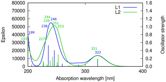 Theoretical prediction of the absorption spectrum of ligands HL1 (blue line) and HL2 (green line) in acetonitrile calculated with the PBE0 functional. Sticks correspond to the precise theoretical transition wavelength and oscillator strength, while the convoluted spectrum is obtained as their Gaussian fit.