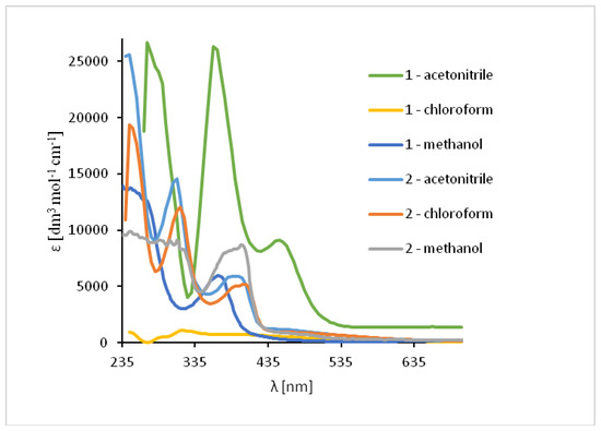 The absorption of UV-vis and fluorescence spectra of the ligands and their complexes were recorded at room temperature in various solvents of different polarity (MeCN, chloroform and methanol) (Figures 7 and 9–11, Table S3).