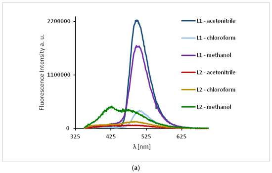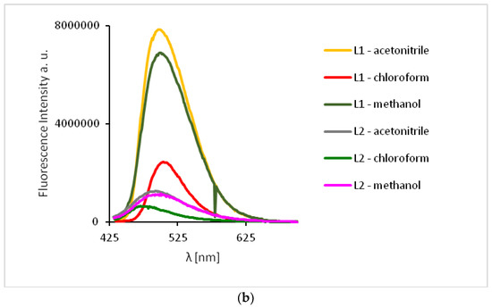 Solution emission spectra of ligands HL1 and HL2. (a) λex = 296 nm, (b) λex = 422 nm, (MeCN, chloroform and methanol 1 × 10−4 mol/dm3, RT).