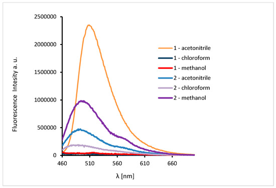 The excitation of 1 and 2 in all the solvents at 450 nm resulted in blue emission between 497–509 nm for 1 and 489–500 nm for 2 (Figure 11). For the both complexes, slight hipsochromic shifts of emission bands were observed when shifts of the ligands in all the solvents were compared. This can be caused by lowering the ligand lability and changes in the molecular geometry of the excited state, which implies a decrease in the resonance energy. Spectra of 1 and 2 exhibit an increase in the fluorescence intensity in polar solvents and bathochromic shifts with increasing solvent polarity. The fluorescence intensity of HL2 and 2 was significantly lower in comparison with that of the solutions of HL1 and 1, respectively (Figure 10 and Figure 11). This can result from the presence of the chloride bridge between the copper centers, which then causes lowering of the ligand lability, a different pathway of non-radiative transition, and finally, lowering of the fluorescence intensity.