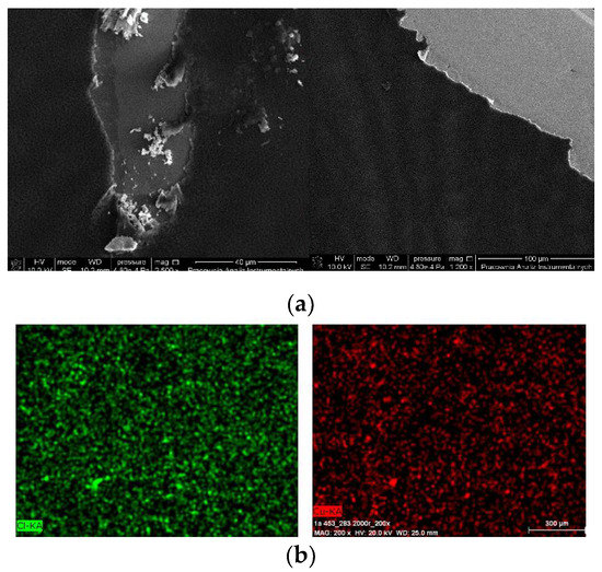 The thin, homogeneous films of complexes were obtained at silicon surfaces first immobilized with PPMA. The visible scratches on the surface of the film in the SEM images show the edge of the thin complex layer, which clearly indicate the presence of the copper(II) complex layers what was additionally confirmed with the EDS results (Cu 6.80 mass%, Cl 5.69 mass%). Moreover, the mapping EDS confirmed the presence of copper(II) complex over the entire layer (Figure 12b).