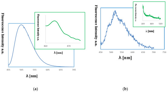 The study of the ligands fluorescence properties showed emission between 497–506 nm (HL1) and 470–492 nm (HL2) (λex = 296 nm), while excitation at 422 nm led to a stronger emission intensity in the range of 498–503 nm for HL1 and 471–498 nm for HL2 (Figure 10, Supplementary Table S3). Slight hipsochromic shifts of the emission bands together with a decrease in the solvent polarity were registered. It can be related to the geometry distortion in the excited state, which implies a decrease in the resonance energy.
