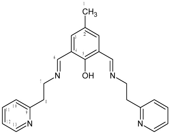 2-hydroxy-5-methyl-1,3-benzenedicarboxaldehyde (0.8208 g; 5 mmol) and 2-(2-pirydyl)ethylamine (1.26 mL; 10 mmol) were stirred in methanol for 3 h at RT (orange solution), then to the mixture sodium tetrafluoroborate (0.7600 g) and sodium hydroxide (0.3700 g) in 5 mL water were added. After 6 h stirring the reaction mixture (yellow solution) was reduced in volume on a rotary evaporator and extracted with chloroform (3 × 25 mL). The combined extracts were dried on anhydrous magnesium sulfate. The solution was filtered and the solvent was removed on a rotary evaporator. The product was a yellow oil (m = 1.7506 g, 4.7 mmol, Yield 94%). C23H24N4O (calc./found%): C 74.16/74.19, N 15.04/14.96, H 6.49/6.42.