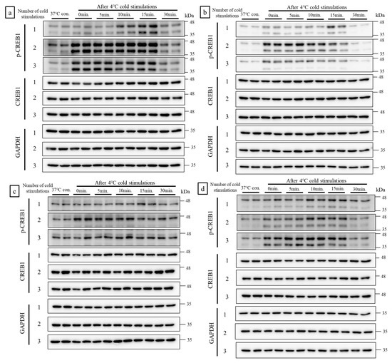 Cells subjected to cold stimulations were dissolved in lysis buffer (50 mM Tris-HCl (pH 7.4), 150 mM NaCl, 1% NP40, 1 mM EDTA, 10 mM NaF, and 2 mM Na3VO4) with protease inhibitor cocktail (Nakalai Tesque, Nakagyo, Kyoto, Japan). The cell lysates were centrifuged at 12,000× g for 15 min at 4 °C, and total protein in the supernatants was measured with a bicinchoninic acid (BCA) protein assay kit (TaKaRa Bio, Kusatsu, Shiga, Japan). The protein concentrations were adjusted to 2 mg/mL with SDS-PAGE buffer and the samples were heated to 95 °C for 5 min. Ten microgram protein samples were subjected to 10% SDS-PAGE at 140 V for 80 min. The gel-bound proteins were applied to polyvinylidene fluoride (PVDF) membranes by the wet transfer method, and run overnight at 40 V. Target protein bands ware detected using the primary antibodies anti-phosphorylated-CREB (p-CREB) (#9189; Cell Signaling Technology, Danvers, MA, USA), anti-CREB (#9189; Cell Signaling Technology), and anti-glyceraldehyde 3-phosphate dehydrogenase (GAPDH) (sc-32233; Santa Cruz Biotechnology, Dallas, TX, USA) and the secondary horseradish peroxidase (HRP)-linked antibodies anti-mouse IgG (#7076; Cell Signaling Technology) and anti-rabbit IgG (#7074; Cell Signaling Technology) in a luminescence detector. All WB raw data are provided as Supplemental Data 1.