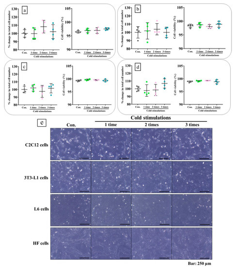With regard to Section 4.1.2, the C2C12, 3T3-L, HF, and L6 cells were seeded and the cold stimulations were performed. Twenty-four hours after the final cold stimulation, cell morphology was examined and a trypan blue assay was performed using a hemocytometer (n = 4 per group) to evaluate cell damages by cold stimulations, as previously described [].