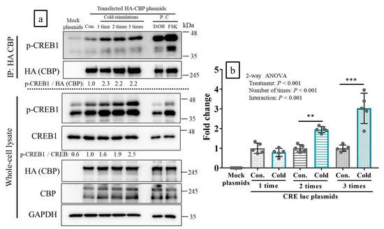 Cold stimulation induced recruitment of CREB-binding protein (CBP) to phosphorylated-CREB1 (p-CREB1) and activated CREB transcription in vitro. (a): Immunoprecipitation and western blot (WB) analyses to assess for the recruitment of CBP to p-CREB1 upon cold stimulations. P.C lanes show positive control with forskolin (FSK) or ethanol (EtOH), to confirm the association of CBP with p-CREB. Mock plasmids were used as negative controls, and cAMP response element (CRE)- luciferase (luc) plasmids were used to measure the transcriptional activities of CREB. (b): Reporter assay to analyze the transcriptional activities of CREB upon cold stimulations using CRE-luc plasmids (n = 5 per group). Mock plasmids were used as negative controls with values of approximately 0. Con: control (no cold-stimulation). Cold: 15-min cold-stimulations. ** p < 0.01, *** p < 0.001 according to Bonferroni correction as a post-hoc test.