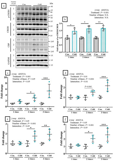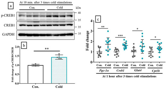 Ten minutes following the third cold stimulation, CREB1 phosphorylation was significantly induced in the TA muscle (Figure 5a,b). By 1 h, the CREB1-targeting genes were also significantly upregulated (Figure 5c).