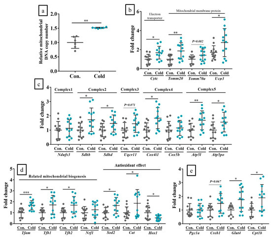 Chronic cold stimulation increased mitochondrial DNA (mtDNA) copy number and mitochondrial biogenesis in vivo. (a): Mitochondrial DNA copy number; (b): mitochondrial component genes; (c): mitochondrial complex genes; (d): Pgc1-α regulated genes; (e): CREB-targeting genes in response to chronic in vivo cold stimulation. Con: Control (no cold stimulation); Cold: 15-min cold stimulations. n = 12 per group. * p < 0.05, ** p < 0.01, *** p < 0.001 according to Welch’s t-test.