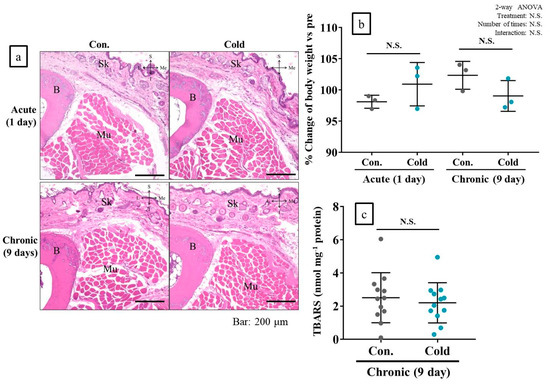 Acute and chronic cold stimulations did not induce adverse effects in muscle, bone, or skin tissue, and did not alter body weight in vivo. (a): Representative hematoxylin and eosin (H&E)-stained tissue sample; (b): % change in body weight relative to pre-experiment; (c): thiobarbituric acid reactive substances (TBARS) levels in limb muscle in response to chronic cold stimulation. B: Bone (second metatarsal); Sk: Skin; Mu: muscle (first dorsal interosseous muscles of foot); S: Superior; I: Inferior; L: Lateral; Me: Medial. Con: Control (no cold stimulation); Cold: 15-min cold stimulation. n = 3 for body weight and n = 12 for TBARS levels. N.S.: Not significant.