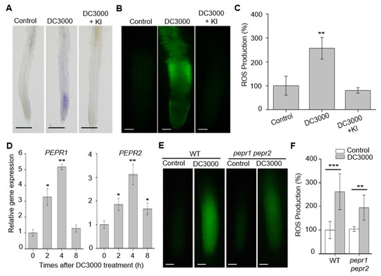 The Arabidopsis PEPR1 and PEPR2 are stereotypical LRR-RLKs reported to regulate plant immunity, as the disruption of the genes encoding these receptors compromise plant immunity and enhance pathogen proliferation in plant leaves [8,9,30]. Both of the genes express in leaf and root tissues [10]. To evaluate whether PEPR1 and PEPR2 take part in root immunity, we first resorted to the real-time quantitative reverse transcription PCR (qRT-PCR) assay to measure the mRNA levels of the PEPR1 and PEPR2 over a time course upon Pst DC3000 treatment. We found that the expression of PEPR1 and PEPR2 were induced in roots after pathogen treatment, as shown in Figure 1D, consistently with the leaf responses, as shown in Figure S1, implying that PEPRs may be involved in plant immune responses in both root and leave tissues. Furthermore, we inoculated the seedlings with a Pst DC3000 bacterial suspension, followed by an examination of ROS (H2O2) production. We found that the root structure in the WT and pepr1 pepr2 seedlings did not show significant difference upon Pst DC3000 treatment, as shown in Figure S2. The roots from the mutant plants pepr1 pepr2 showed increased ROS under Pst DC3000 treatment, but the ROS levels were much lower than those in wild type roots, as shown in Figure 1E–F. Taken together, these results suggest that PEPRs are required to regulate root immunity.