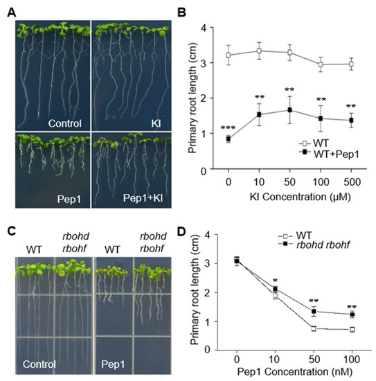 The application of elicitor peptides to plants not only enhances plant immunity, but also impairs plant development. Our previous results indicated that Pep1 induced a strong inhibition in root growth [13]. The strong induction of ROS by the Pep1–PEPRs system in roots raises a question of whether this event causes the root growth inhibition, as the application of exogenous H2O2 was also shown to inhibit root growth, as shown in Figure S3, in agreement with the previous study [29]. To figure this out, we treated the seedling roots with Pep1 in the presence of various concentrations of KI. As shown in Figure 4A–B, the addition of KI significantly undermined the Pep1 effect on root growth inhibition, with 50 μM KI achieving the maximum mitigation, suggesting that Pep1 intersects with ROS signaling to regulate root growth. We further detected the root growth in rbohd rbohf double mutants upon Pep1 treatment and found that the double mutant decreased the Pep1 sensitivity, as shown in Figure 4C–D, suggesting that RBOHD and RBOHF are required for Pep1-regulated root growth. Taken together, these data suggest that Pep1, in turn, activates the ROS signaling to inhibit root growth.