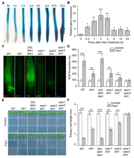 The botrytis-induced kinase 1 (BIK1) functions downstream of the Pep1–PEPR1 system to mediate ROS production and leaf immunity [21,24,28]. BIK1 interacts with and phosphorylates the RBOHD to initiate ROS production [21]. To investigate whether BIK1 is required to regulate Pep1–PEPRs signaling in root tissues, firstly, we constructed the proBIK1:GUS transgenic plants to analyze the expression pattern of BIK1 under Pep1 treatment. The GUS staining analysis showed that the BIK1 promoter conferred relatively high signals in the vascular tissues of the root elongation and maturation zone, but not in the meristematic zone, as shown in Figure 5A, in agreement with the previous results [35]. Under the Pep1 treatments, the GUS staining signals appeared at the meristematic zone within 2 h, and the staining intensities were gradually enhanced along the Pep1 treatment, as shown in Figure 5A. Because GUS activity is stable over a long period of time, it is not suitable for measuring the kinetics of gene expression over a time course. We, therefore, performed qRT-PCR to measure the native mRNA levels of the BIK1 over a time course upon Pep1 treatment. As shown in Figure 5B, the mRNA levels of BIK1 in roots were strongly increased after exposure to 100 nM Pep1, consistent with the GUS assay results. These data indicate that the expression of BIK1 is induced by Pep1 signaling in plant root.
