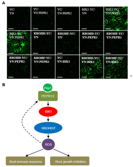 To confirm the connection between BIK1 and PEPRs, we performed bimolecular fluorescence complementation (BiFC) experiments by transforming the YN:PEPR1 or YN:PEPR2 plasmid with the BIK1:YC plasmid into tobacco leaves. In addition to PEPR1, we found that PEPR2 could also directly interact with BIK1, as shown in Figure 6A. These results are consistent with the notion that both PEPR1 and PEPR2 interact with BIK1 to regulate plant immunity. The PEPR1-BIK1 component is the main focus on leaves, whereas the PEPR2-BIK1 component functions in roots to regulate root immunity and development. Furthermore, we continually analyzed the relationship between PEPRs or BIK1 with RBOHD/F. We transformed the YN:PEPRs or YN:BIK1 plasmid with the RBOHD:YC or RBOHF:YC plasmid into tobacco leaves, and found that BIK1, but not PEPRs, were shown to interact with RBOHD and RBOHF, suggesting that BIK1 should be a central hub to connect the PEPRs and RBOHD/F, as shown in Figure 6A.