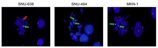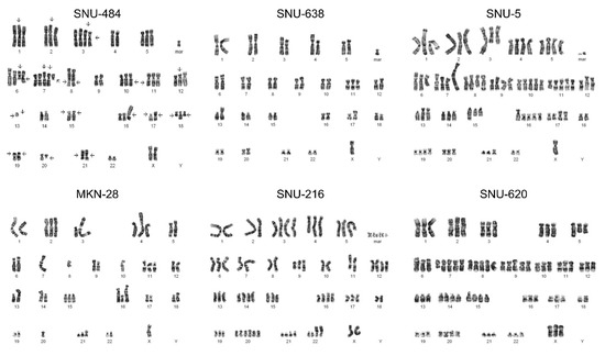- Chun, Y.H.; Kil, J.I.; Suh, Y.S.; Kim, S.H.; Kim, H.; Park, S.H. Characterization of chromosomal aberrations in human gastric carcinoma cell lines using chromosome painting. Cancer Genet. Cytogenet. 2000, 119, 18–25. [Google Scholar] [CrossRef]