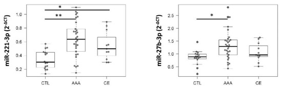Boxplots of the expression levels of miR-221-3p and miR-27b-3p in plasma samples of abdominal aortic aneurysm (AAA) patients compared with healthy controls and carotid endarterectomy (CE) group. Significant differences are shown as *, p < 0.05 and **, p < 0.001. CTL, control group (n = 16); AAA, aneurysm patients (n = 30); CE, patients with severe atherosclerosis (n = 11).
