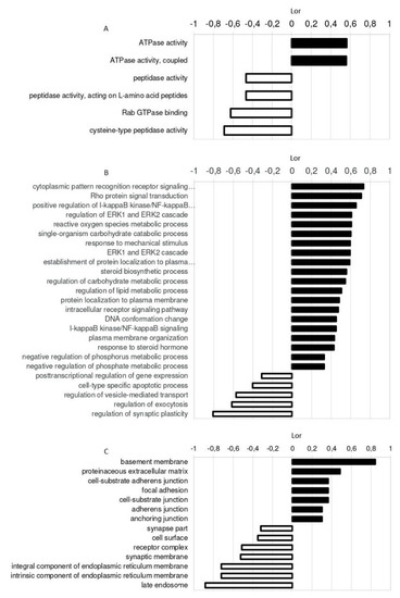 Gene Ontology (GO) enrichment analysis of nine miRNAs (miR-144-3p, miR-146a-5p, miR-21-5p, and miR-103a, miR-1, miR-133b, miR-27b-3p, miR-195-5p, and miR-29b-3p) dysregulated in tissue of AAA patients compared with CTL. miR-133a was not included in the analysis because its high homology with miR-133b causes the sharing of most of the targets. Significant enriched (A) molecular functions (MF), (B) biological processes (BP), and (C) cellular components (CC) are represented. Bars represent the degree of regulation measured by the logarithm of ratio (Lor).
